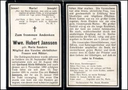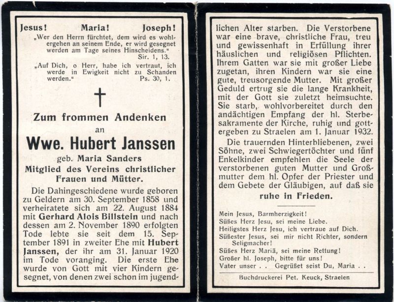 | ∞ 22.8.1884 Gerhard Alois Billstein, † 2.11.1890; ∞ 15.9.1891 Hubert Janssen, †; 4 K. aus 1. Ehe, davon 2 jugendl. †; Druck in Straelen |