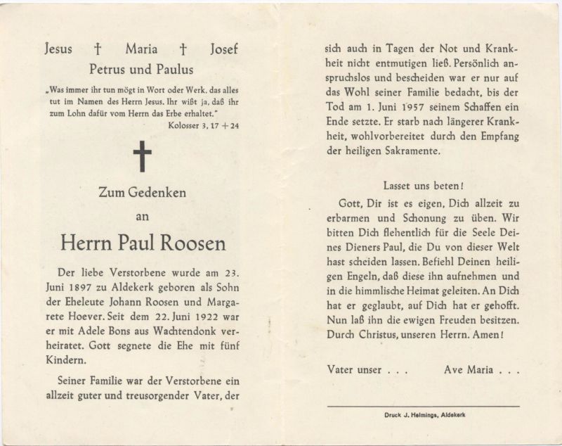 | Eltern: Johann R∞sen u. Margarete Hoever; ∞ 22.6.1922 Adele Bons aus Wachtendonk; 5 K.; Druck in Aldekerk |
