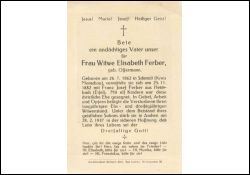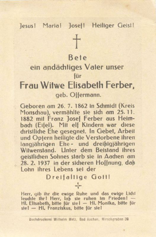 | Seit 30 J. Witwe; ∞ 25.11.1882 Franz Josef Ferber aus Heimbach, Eifel, †; 11 K.; sie starb unter dem Beistand ihres geistlichen Sohnes; Druck in Aachen |