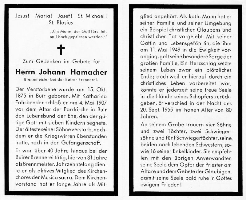 31 J. Brennmeister b.d. Buirer Brennerei; ∞ 4.5.1907 Katharina Faßbender in Buir, † 11.5.1949; 7 K.; ältester Sohn † in Gefangenschaft (2. Weltkrieg); Mitgl. Kirchenchor u. kirchenvorstand |