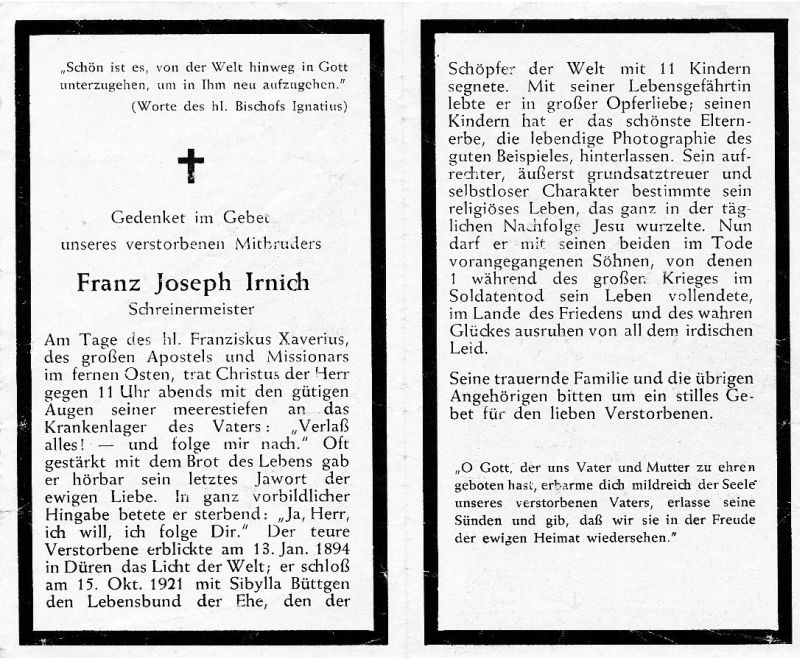 | Schreinermeister; ∞ 15.10.1921 Sibylla Büttgen; 11 K., davon 1 †; 1Sohn im 2. Weltkrieg gefallen |