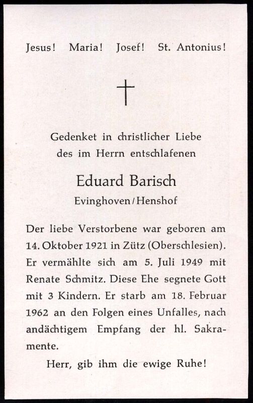 Tod infolge eines Unfalls; Wohnort: Evinghoven, Henshof; ∞ 5.7.1949 Renate Schmitz; 3 K. |