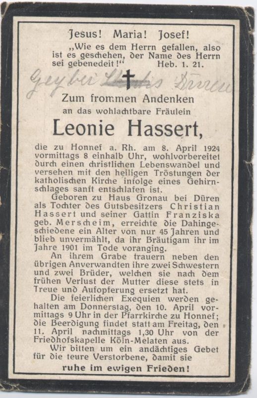 Fräulein; 45 J.; unvermählt, da ihr Bräutigam 1901 †; Beerdigung: Köln-Melaten |