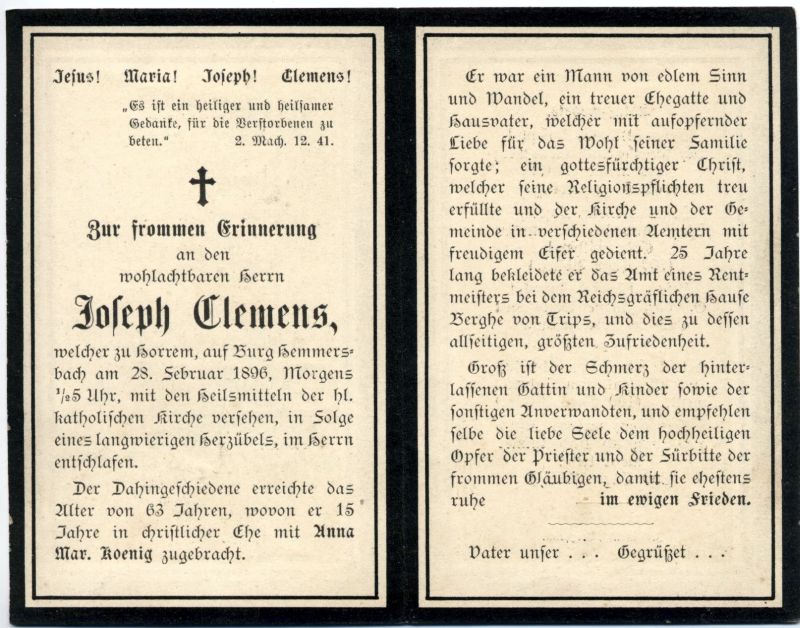 63 J.; 15 J. Ehe mit Anna Maria Koenig; 25 J. Rentmeister beim Reichsgräflichen Hause Berghe von Trips; Kinder |