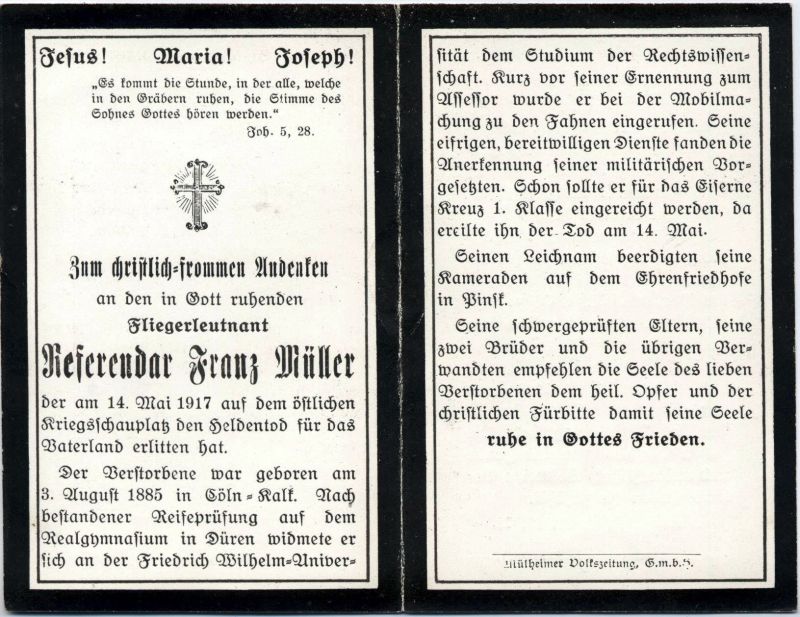 Gefallener 1. Weltkrieg; Abitur in Düren, Realgymnasium; Jurastudium in Bonn; Referendar; kurz vor Ernennung zum Assessor Einberufung; Druck in Mülheim |