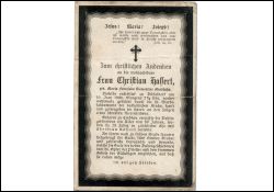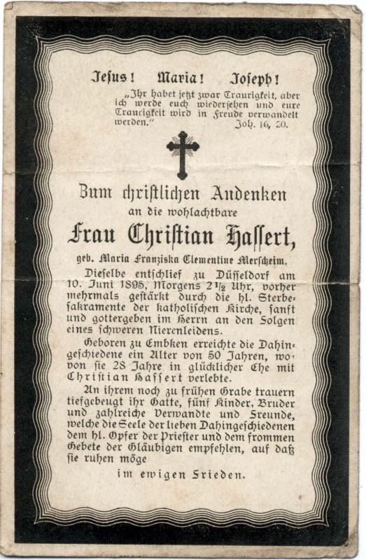 50 J.; schweres Nierenleiden; 25 J. verheiratet mit Christian Hassert; 5 überlebende Kinder |