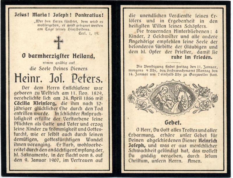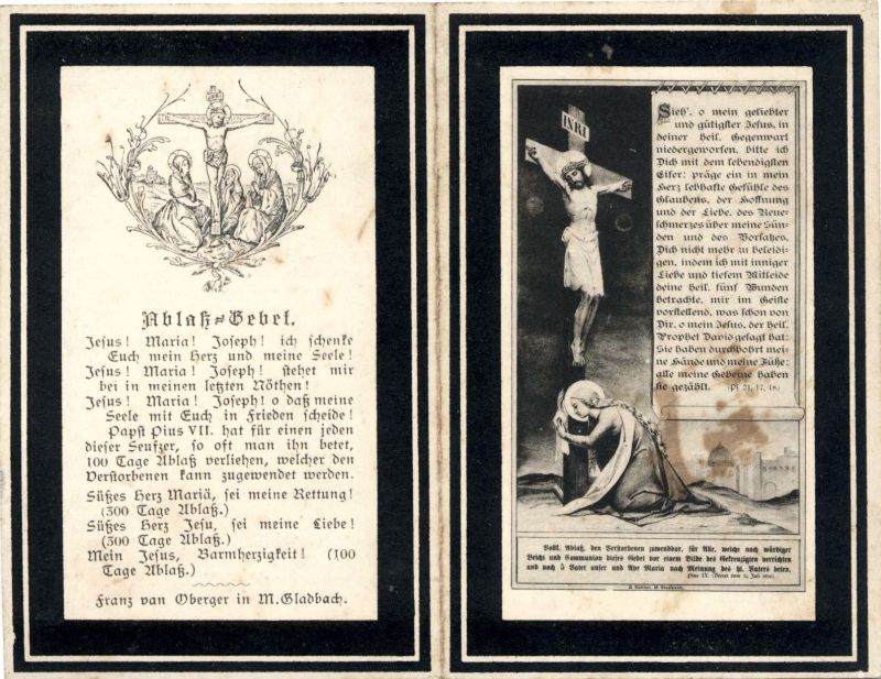 ∞ 24.4.1866 Cäcilia Kleinsorg, † nach 32 J. Ehe; 4 überlebende Kinder; Druck in Mönchengladbach |