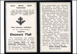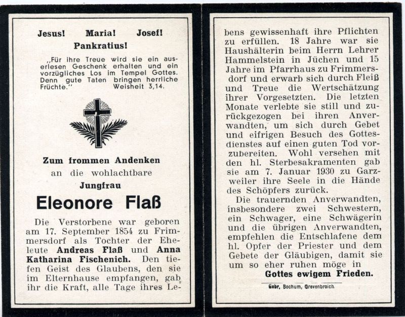Jungfrau; Eltern: Andreas Flaß u. Anna Katharina geb. Fischenich; 18 J. Haushälterin bei Lehrer Hammelstein in Jüchen; 15 J. im Pfarrhaus zu Frimmersdorf; Druck in Grevenbroich |