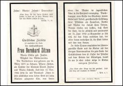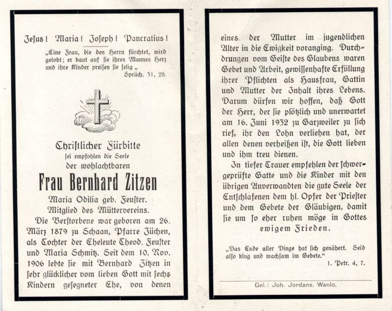 Mitgl. Mütterverein; Eltern: Theodor Feuster u. Maria geb. Schmitz; ∞ 10.11.1906 Bernhard Zitzen; 6 K., davon 1 jugendl. †; Druck in Wanlo |