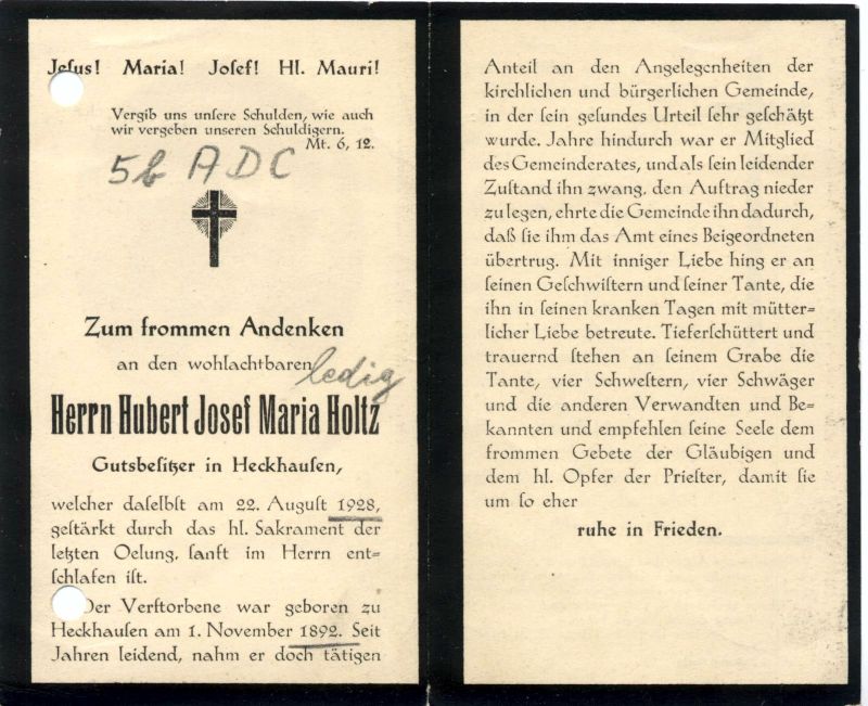 Gutsbesitzer; seit Jahren leidend; Mitgl. Gemeinderat; Beigeordneter; ledig |