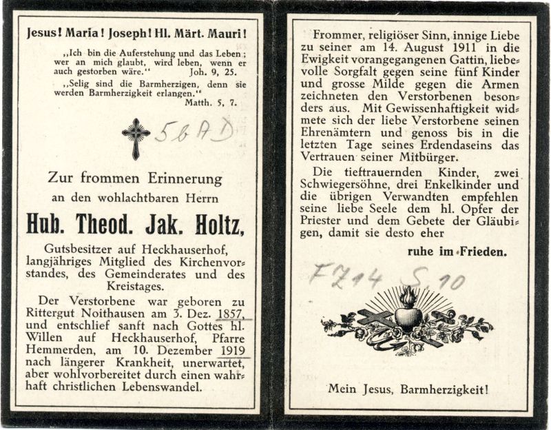 Gutsbesitzer auf Heckhauserhof; Mitgl. Kirchenvorstand, Gemeinderat u. Kreistag; längere Krankheit; Ehefrau † 14.8.1911; 5 K. |