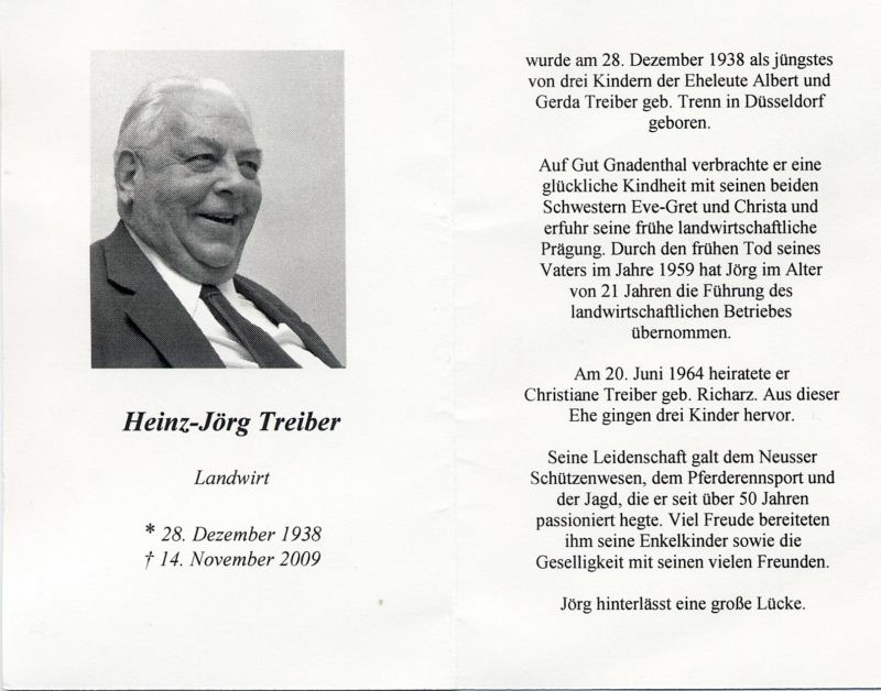 Landwirt; Eltern: Albert Treiber u. Gerda geb. Trenn; Kindheit auf Gut Gnadenthal /mit Schwestern Eve-Gret u. Christa); früher Tod des Vaters 1959, übernahm deshalb mit 21 J. die Führung des landw. Betgriebs; ∞ 20.6.1964 Christiane Richarz; 3 K.; seine Leidenschaft galt dem Neusser Schützenwesen, dem Pferdesport u. der Jagd |