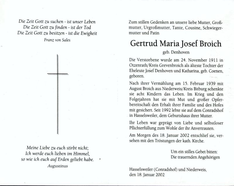 Eltern: Josef Denhoven u. Katharina geb. Coenen; ∞ 15.2.1939 August Broich aus Niederweis, Kr. Bitburg; 8 K.; seit 1992 auf dem Conradshof in Hasselsweiler, dem Geburtshaus ihrer Mutter |