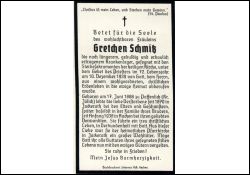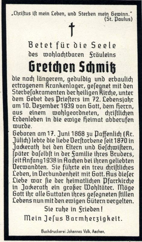 Längeres Krankenlager; Fräulein; lebte seit 1870 in Jackerath b. Eltern u. Geschwistern, später dasyelbst b. ihrem Bruder; seit Anfang 1938 in Aachen b. Verwandten; Wohltäterin der heimatl. Pfarrkirche in Jackerath |