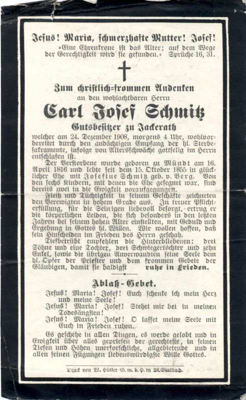 Gutsbesitzer in Jackerath; ∞ 15.10.1855 Josefine v. Berg; 6 K., davon 2 †; in den letzten Jahren leidend |
