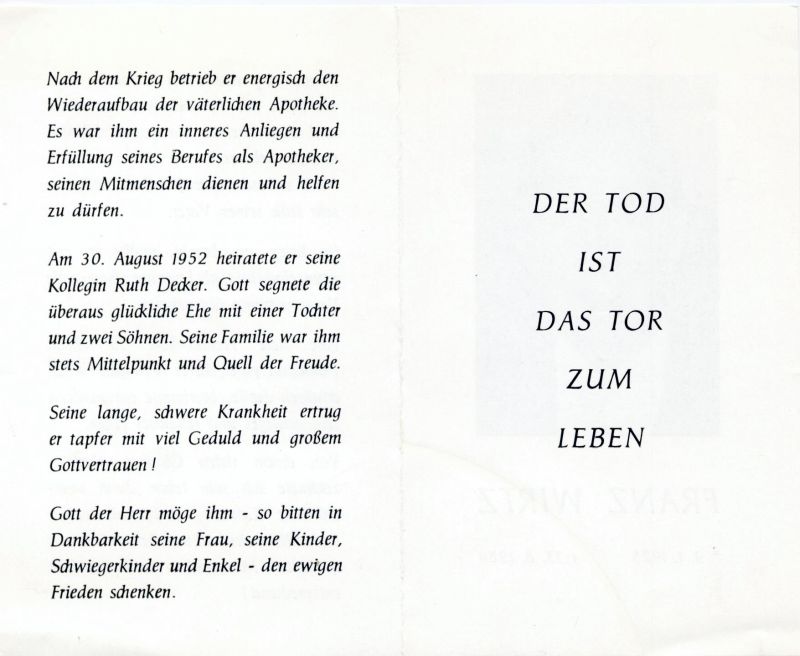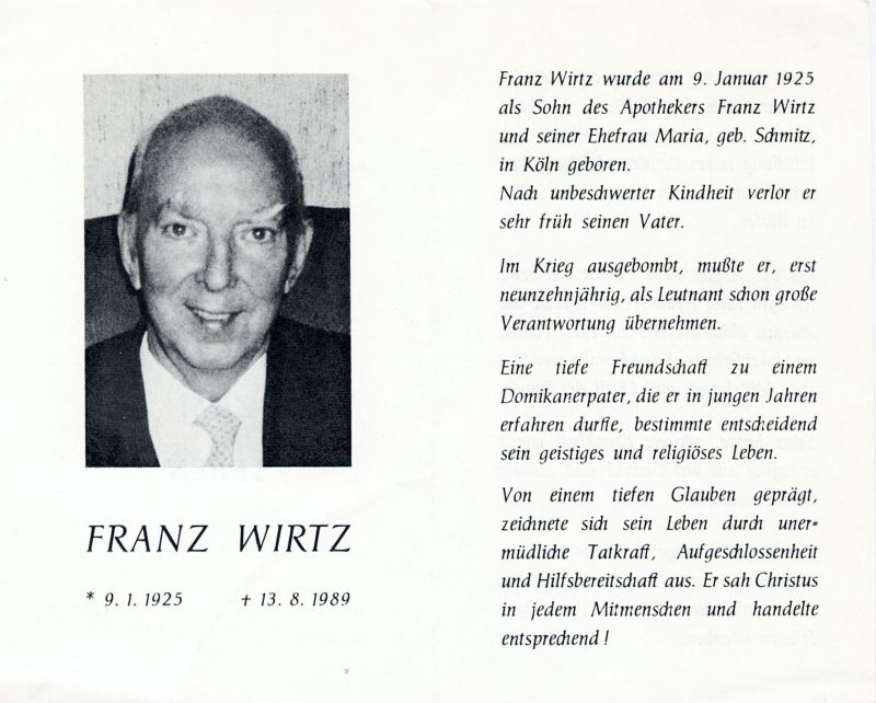 Eltern: Apotheker Franz Wirtz u. Maria geb. Schmitz; im Krieg ausgebombt; Leutnant im 2. Weltkrieg; Apotheker; Wiederaufbau der väterlichen Apotheke; ∞ 30.8.1952 seine Kollegin Ruth Decker; 3 K.; lange, schwedre Krankheit |
