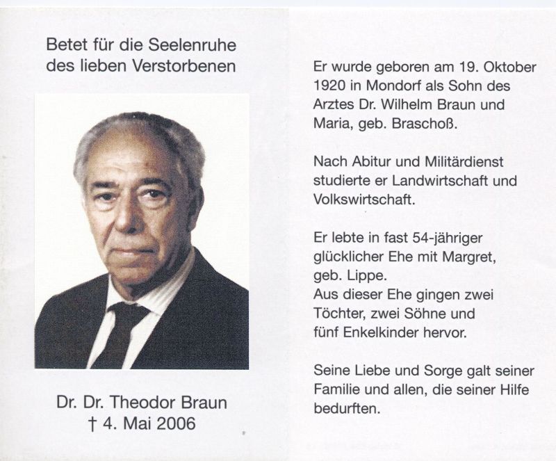 Eltern: Dr. Wilhelm Braun (Arzt) u. Maria geb. Braschoß; nach abitur u. Militärdienst studierte er Land- und Volkswirtschaft; fast 54 J. verheiratet mit Margret geb. Lippe; 4 K. |