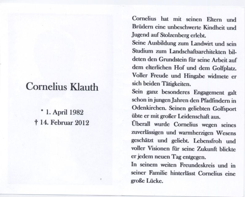 Kindheit und Jugend verlebte er auf Stolzenberg; Landwirt u. Landschaftsarchitekt; wirkte auf dem elterl. Hof und dem Golfplatz; in jungen Jahren engagierte er sich bei den Pfadfindern in Odenkirchen; seine Leidenschaft galt dem Golfsport |