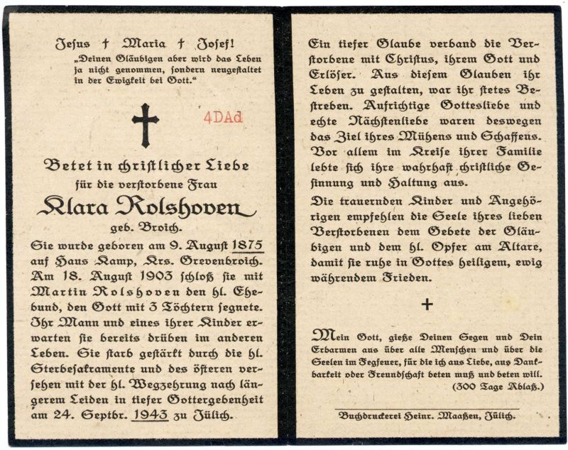 ∞ 18.8.1903 Martin Rolshoven; 3 Töchter; Druck in Jülich |