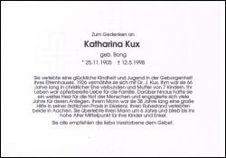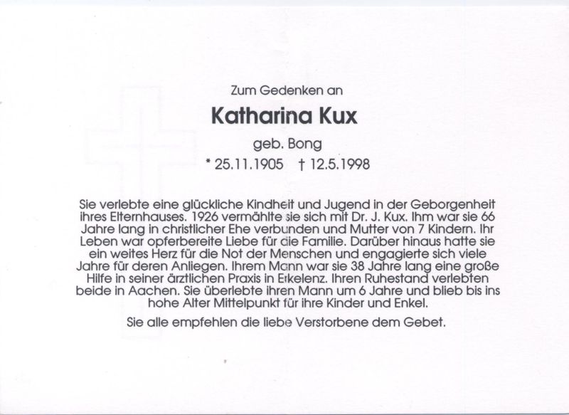 ∞ 1926 Dr. J. Kux, Arzt in Erkelenz; 7 K.; verlebte mit ihrem Mann ihren Ruhestand in Aachen; ihr Mann † vor 6 J. |