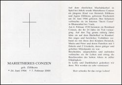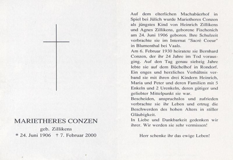 Eltern: Heinrich Zillikens u. Agnes geb. Fischenich; Schulzeit im Internat "Sacré Coeur" in Blumenthal b. Vaals; ∞ 6.2.1930 Bernhard Conzen; lebte seitdem auf dem Büchelhof in Rondorf; 3 K.: Heinrich, Maria, Peter |