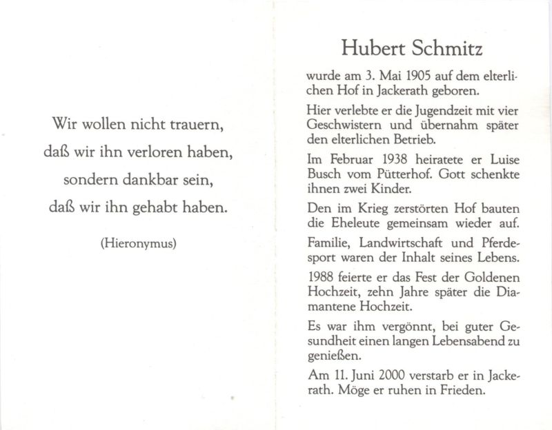 ∞ Febr. 1938 Luise Busch vom Pütterhof; 2 K.; nach 1945 Wiederaufbau des im Krieg zerstörten Hofes; 1988 Goldhochzeit, 1998 Diamantene Hochzeit |