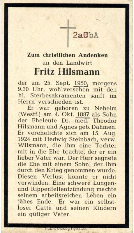 Landwirt; Eltern: Dr. med. Theodor Hilsmann u. Agnes geb. Dahmen; ∞ 15.8.1924 Hedwig Steinbach verw. Wilsmann; 1 Tochter aus 1. Ehe, 1 gemeinsamer Sohn, gefallen im 2. Weltkrieg; Tod nach Lunden- u. Rippenfellentzündung |