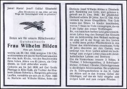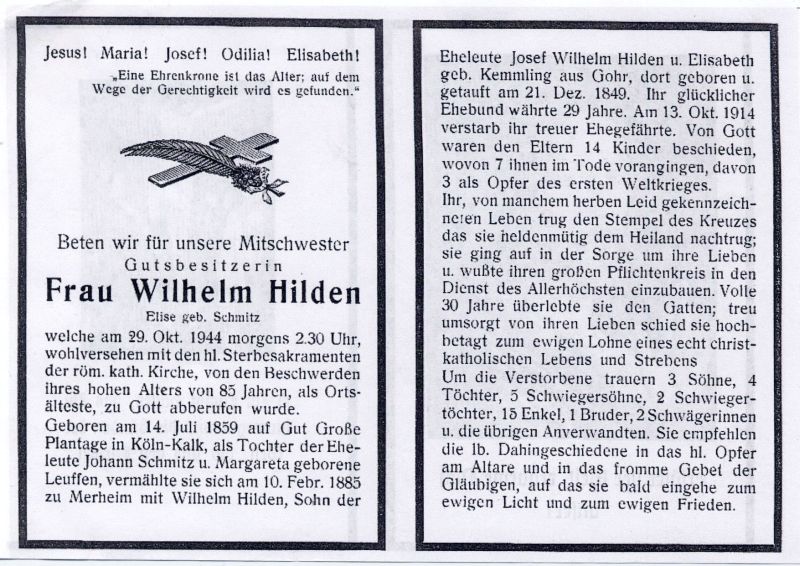 Gutsbesitzerin; Eltern: Johann Schmitz u. Margareta geb. Leuffen; ∞ 10.2.1885 in Merheim Wilhelm Hilden, Sohn der Ehel. Wilhelm Hilden u. Elisabeth geb. Kemmling aus Gohr (*21.12.1949), † 13.10.1914; 14 K., davon 7 †, davon 3 im 1. Weltkrieg gefallen; Wohnort: vermutl. Gohr |