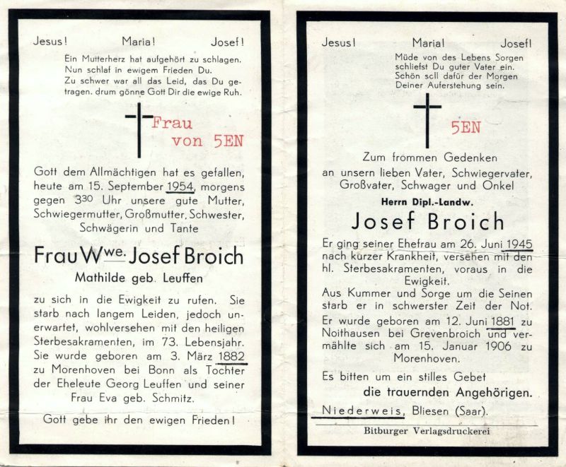 Diplom-Landwirt; er starb aus Kummer u. Sorge um die Seinen in schwerster Zeit der Not; ∞ 15.1.1906 Mathilde Leuffen in Morenhoven; Wohnort: Niederweis; Dsruck in Bitburg |