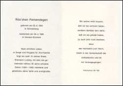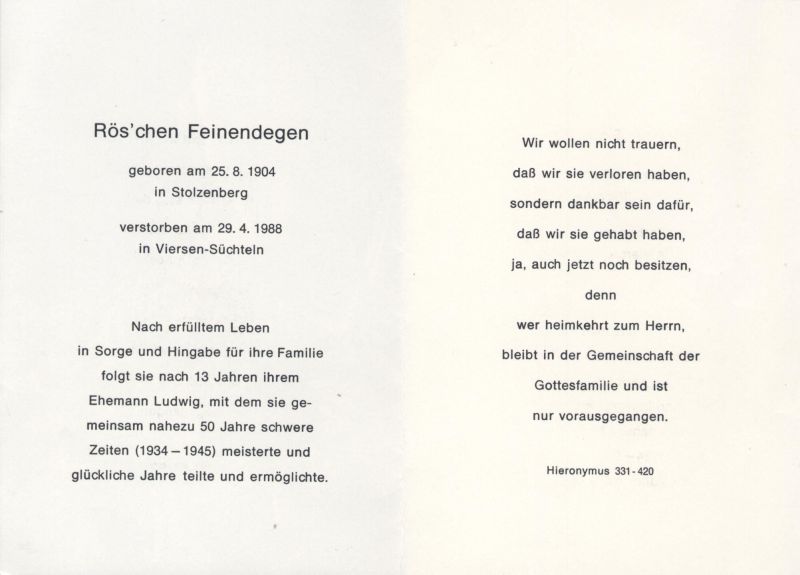 ∞ Ludwig Feinendegen, † vor 13 J.; mit ihm war sie fast 50 J. verheiratet und meisterte mit ihm schwere Zeiten (1934-1945) |
