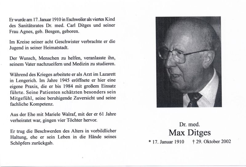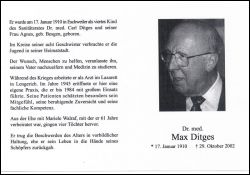 Eltern: Sanitätsrat Dr. med. Carl Dtges u. Agnes geb. Besgen; während des 2. Weltkrieges Lazarettarzt in Lengerich; 1945 Eröffnung einer eigenen Praxis, die er bis 1984 führte; ∞ Mariele Walraf, 61 J. Ehe; 4 Töchter |
