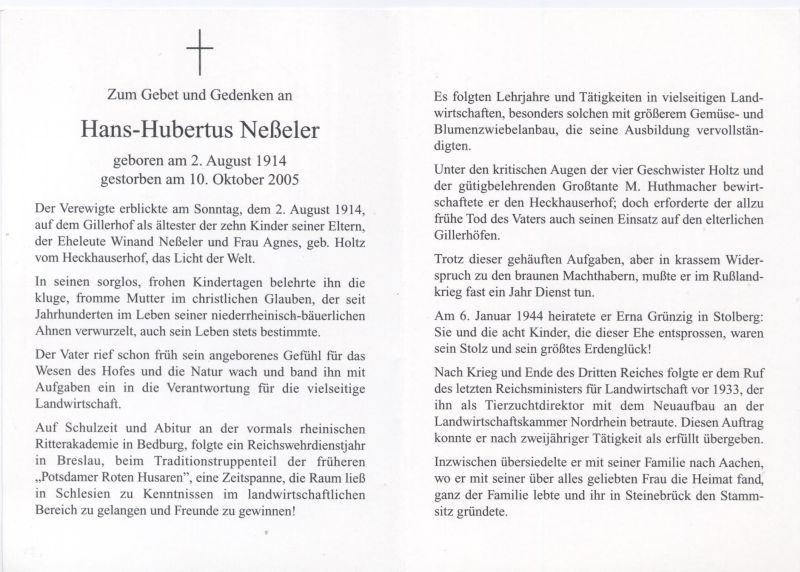 Eltern: Winand Neßeler u. Agnes geb. Holtz vom Heckhauserhof (Grevenbroich-Hemmerden); Abitur Ritterakademie in Bedburg; vielseitige Lehrjahre in der Landwirtschaft; bewirtschaftete den Heckhauserhof und nach dem frühen Tod des Vaters auch die elterl. Gillerhöfe; Soldat im 2. Weltkrieg; ∞ 6.1.1944 Erne Grünzig aus Stolberg; 8 K.; nach 1945 als Tierzuchtdirektor mit dem Wiederaufbau der Landwirtschaftskammer Nordrhein betraut (2 J.); Übersiedlung nach Aachen, dort Aufbau des Stammsitzes in Steinebrück |