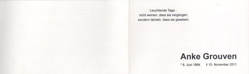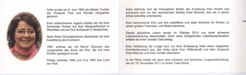 Eltern: Paul u. Renate Hergarden; Jugend auf dem Margarethenhof in Neukirchen; Ausbildung zur Erzieherin; ∞ 1987 Bernd Grouven aus Langerwehe; 2 K.: Philipp, Eva; Okt. 2010 schwere Lebererkrankung; Lebertransplantation; in der Reha Lungenetzündung |