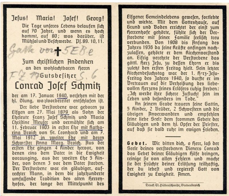 Gutsbesitzer; Eltern: Franz Josef Schmitz u. Maria Christine geb. Meuser; ∞ 11.2.1903 Katharina Broich von St. Leonhard,†; ∞ Mai 1912, Anna Margarete Broich, Schwester seiner ersten Frau; aus 1. Ehe 4 K., davon 1 †; aus 2. Ehe 5 K., davon 3 †; lebte auf dem alten Herrenhof (Fronhof) in Elfgen; Mitgl. Kirchenvorstand 1908-1936; |
