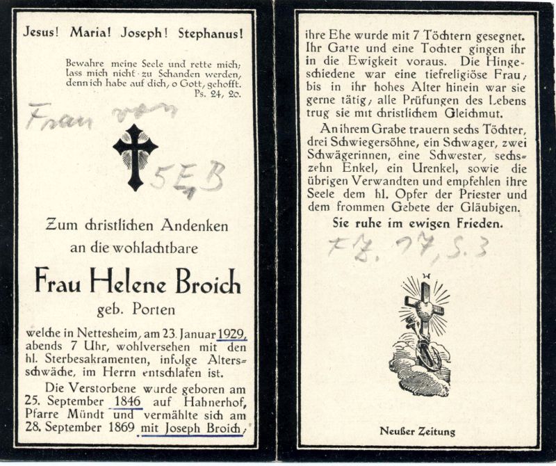 ∞ 28.9.1869 Joseph Broich, †; 7 Töchter, davon 1 †; Druck in Neuss |