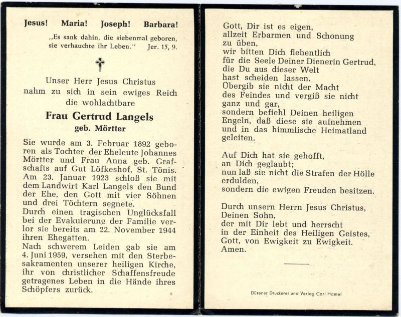 Schweres Leiden; Eltern: Johannes Mörtter u. Anna geb. Grafschafts; ∞ 23.1.1923 Landwirt Karl Langels; 7 K.; Ehegatte bei der Evakuierung am 22.11.1944 durch Unglücksfall †; Druck in Düren |
