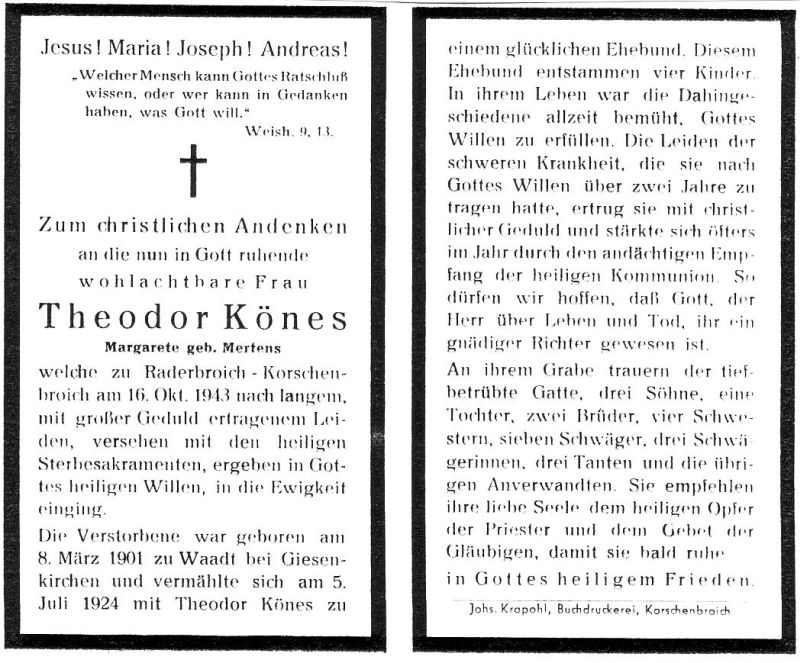 Langes Leiden; ∞ 5.7.1924 Theodor Könes; 4 überlebende Kinder; Druck in Korschenbroich |