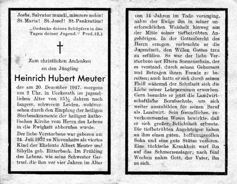 Langes, schweres Leiden; Eltern: Albert Meuter u. Sibylla geb. Ritterbach; ; Schwester Gertrud mit 4 J. vor 14 J. †; Schüler der Landwirtschaftl. Berufsschule |