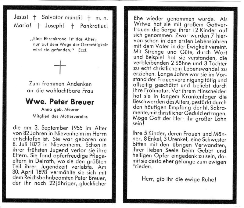 Seit frühester Jugend bei Pflegeelternin Delrath; ∞ 30.4.1898 Reichsbahnbeamter Peter Breuer, † nach 22 J.; 12 K., davon 7 †; Mitgl. Mütterverein; |
