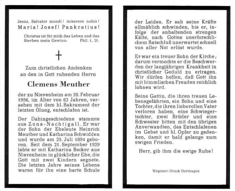 62 J.; Eltern: Heinrich Meuther u. Katharina geb. Schwidden; ∞ 21.9.1929 Katharina Becker aus Nievenheim; 2 K.; in den letzten Jahren leidend |