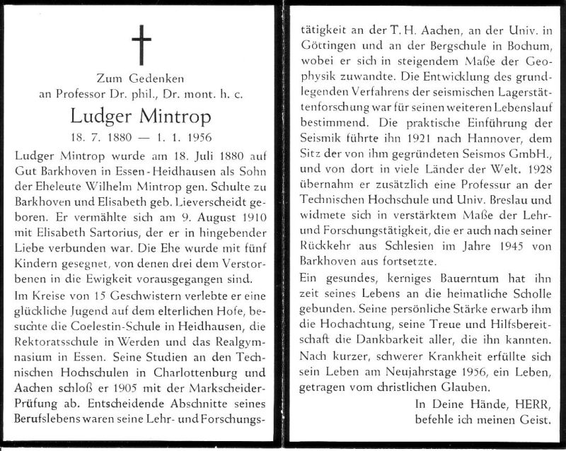 Eltern: Wilhelm Mintrop gen. Schulte zu Barkhoven u. Elisabedth geb. Lieverscheidt; ∞ 9.8.1910 Elisabetrh Sartorius; 5 K., davon 3 †; 15 Geschwister; Schule in Heidhausen, Rektoratsschule in Werden, Realgymnasium in Essen; Studiujm an TH in Charlottenburg u. Aachen; 1905 Markscheider-Prüfung; Lehr- u. Foschungstätigkeit an Univ. Göttingen und Bedrgschule in Bochum; zunehmender Forschungsschwerpunkt: seismische Lagerstättenforschung; Gründung der Seismos Gmb H in Hannover; 1928 Professur in Breslau; 1945 Rückkehr aus Schlesien nach Barkhoven |
