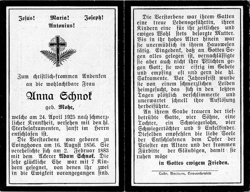 ∞ 2.2.1883 Ackerer Adam Schnok; 7 K., davon 2 †; seit 1 J. leidend; Druck in Grevenbroich |