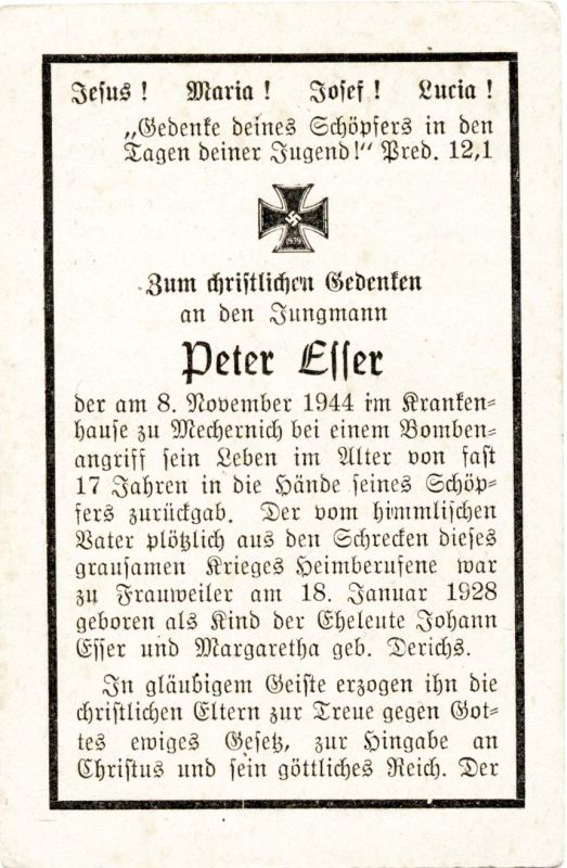 Opfer 2. Weltkrieg; Tod bei Bombenangriff; noch nicht 17 J. alt; Eltern: Johann Esser u. Margaretha geb. Derichs |