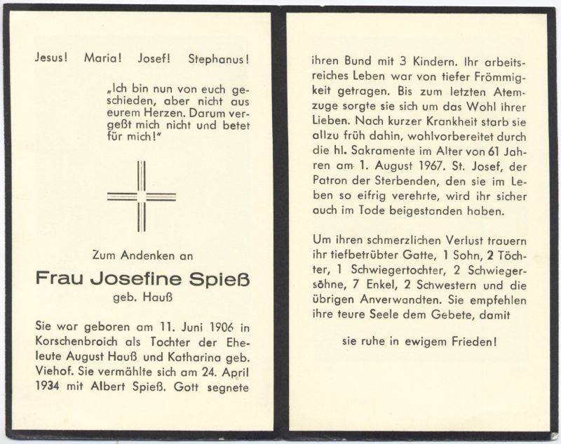 | Eltern: August Hauß u. Katharina geb. Vierhof; ∞ 24.4.1934 Albert Spieß; 3 K. |