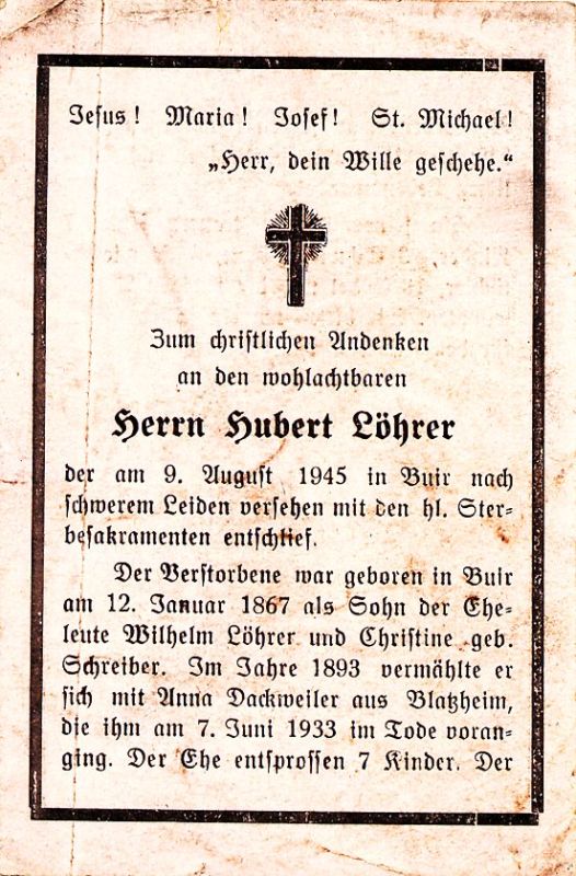 Eltern: Wilhelm Löhrer u. Christine geb. Schreiber; OO 1893 Anna Dackweiler aus Blatzweiler, † 7.6.1933; 7 K. |