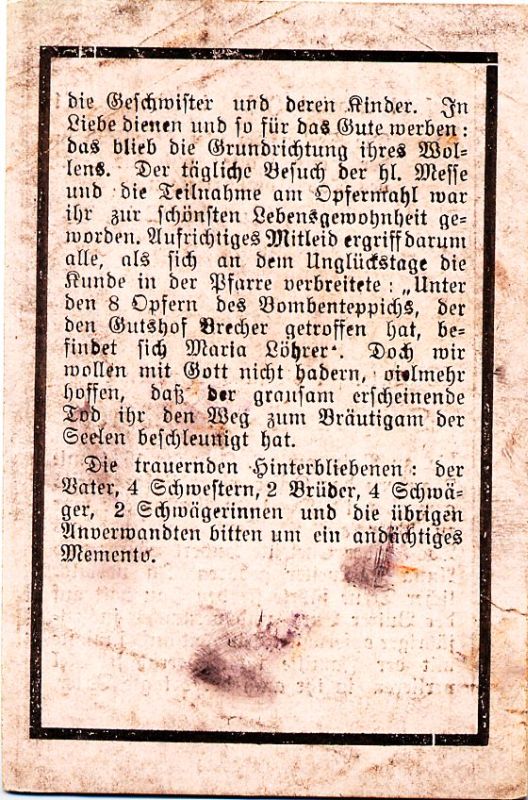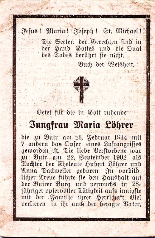 Mit 7 anderen Opfer eines Luftangriffs (Bombenteppich auf Gut Brecher, 2. Weltkrieg); Jungfrau; Eltern: Hubert Löhrer u. Anna geb. Dackweiler; 28 J. führte sie den Haushalt auf der Buirer Burg |