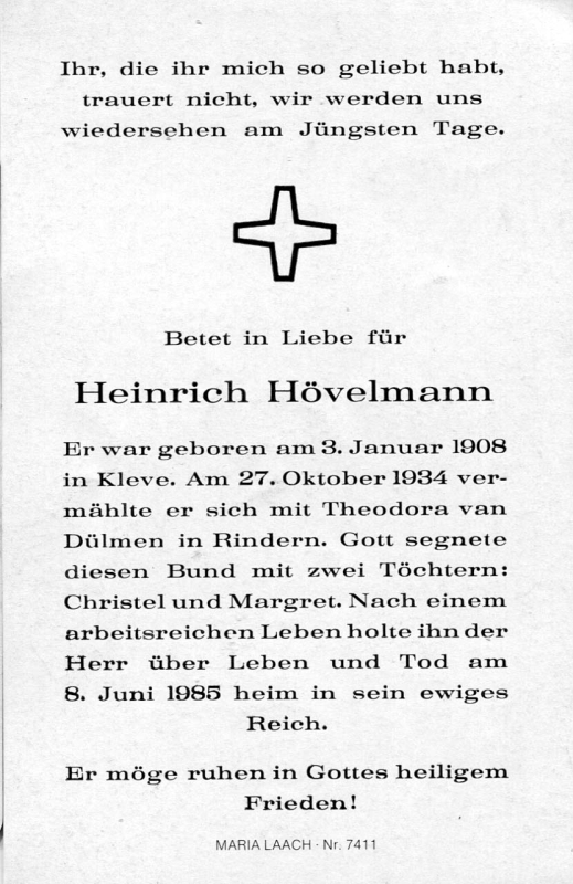 | ∞ 27.10.1934 Theodora van Dülmen aus Rindern; 2 Töchter: Christel, Margret |