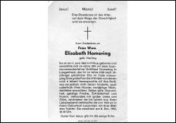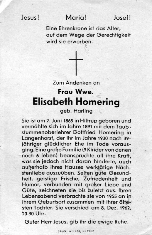 | ∞ 1891 Taubstummenoberlehrer Gottfried Homering in Langenhorst, † 1930; 9 K., davon 3 †; Lebensabend seit 1955 bei ihrer ältesten Tochter in Hiltrup |