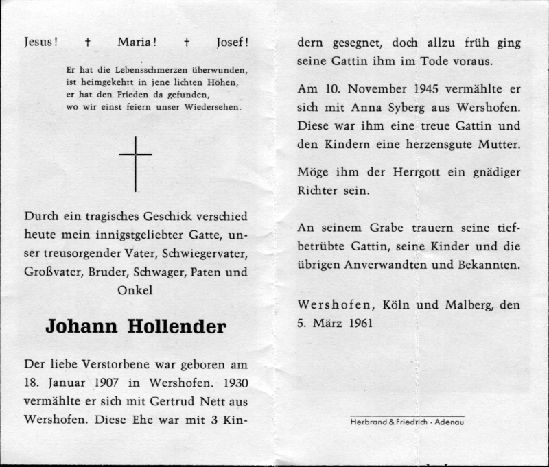 | ∞ 1930 Gertrud Nett aus Wershofen, früh †; 3 K.; ∞ 10.11.1945 Anna Syberg aus Wershofen; Druck in Adenau |
