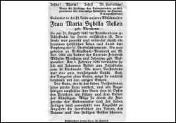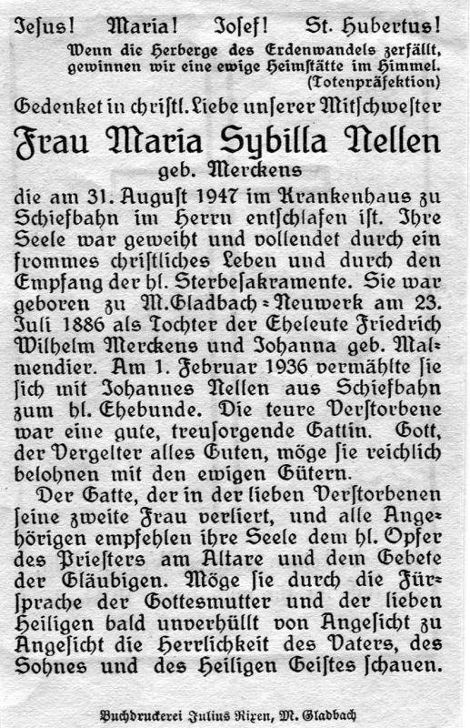 | Eltern: Friedrich Wilhelm Merckens u. Johanna Malmendier; ∞ 1.2.1936 Witwer Johannes Nellen aus Schiefbahn |